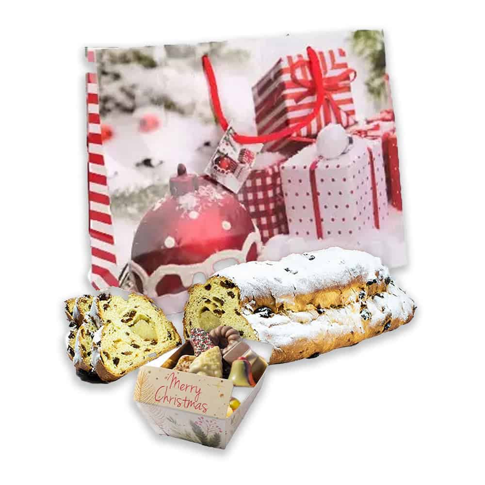 Een prachtg luxe kersttas gevuld met heerlijke kerstchocolade en een luxe kerststol met zuiver amandelspijs. Dit kerstcadeau zal enthousiast ontvangen worden.