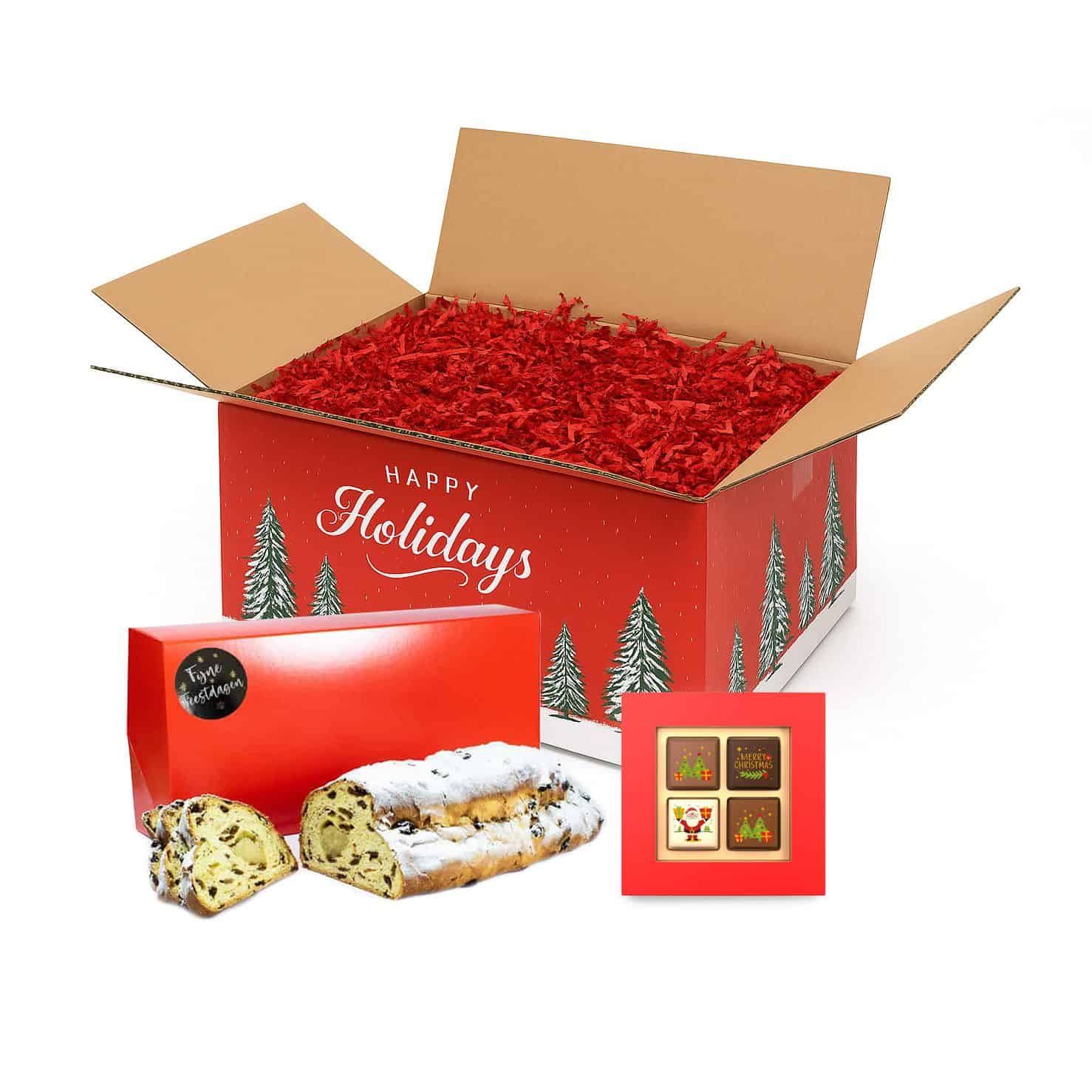 Bestel dit kerstpakket met kerststol en kerstpralines en geef een sfeervol cadeau dat de feestdagen extra bijzonder maakt.